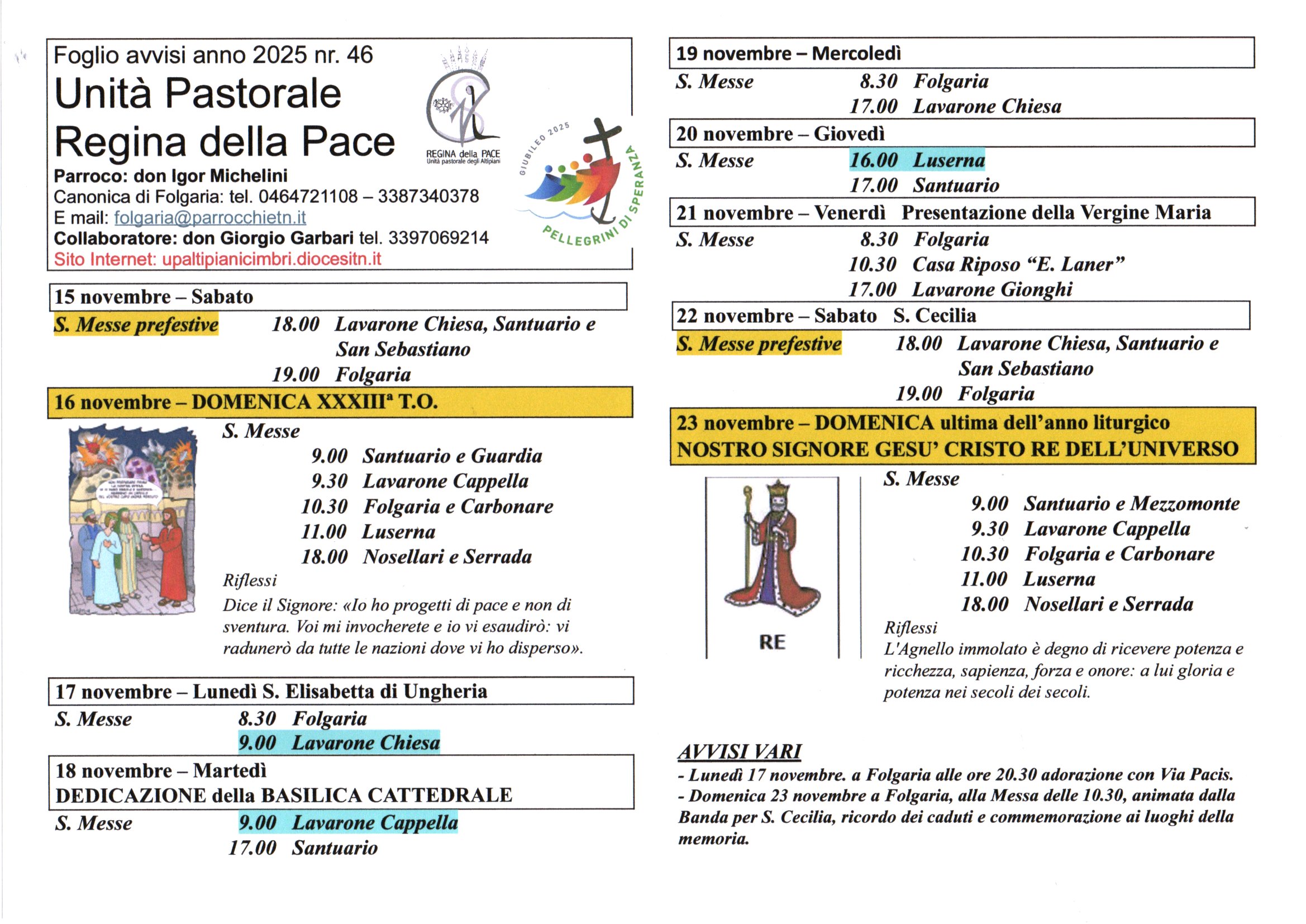 AVVISI SETTIMANALI 16 NOVEMBRE – 23 NOVEMBRE 2025