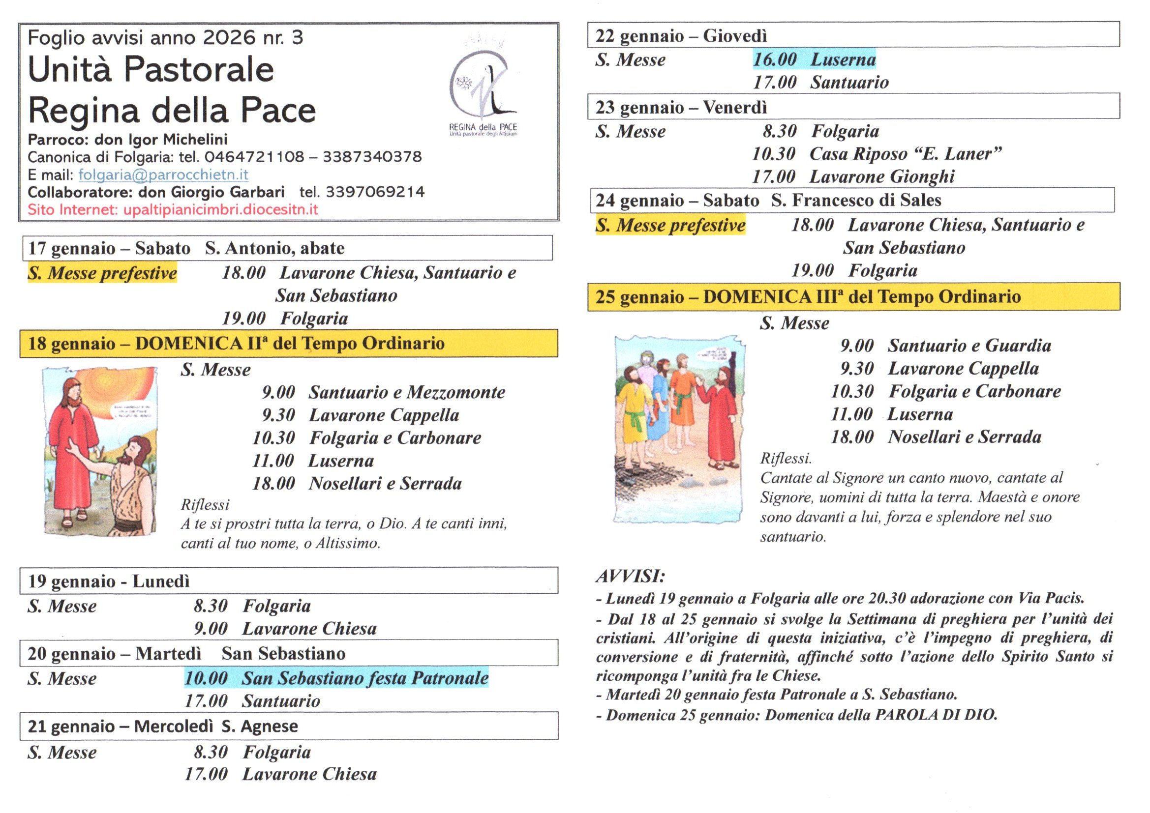 FOGLIO SETTIMANALE 18 GENNAIO – 25 GENNAIO 2026